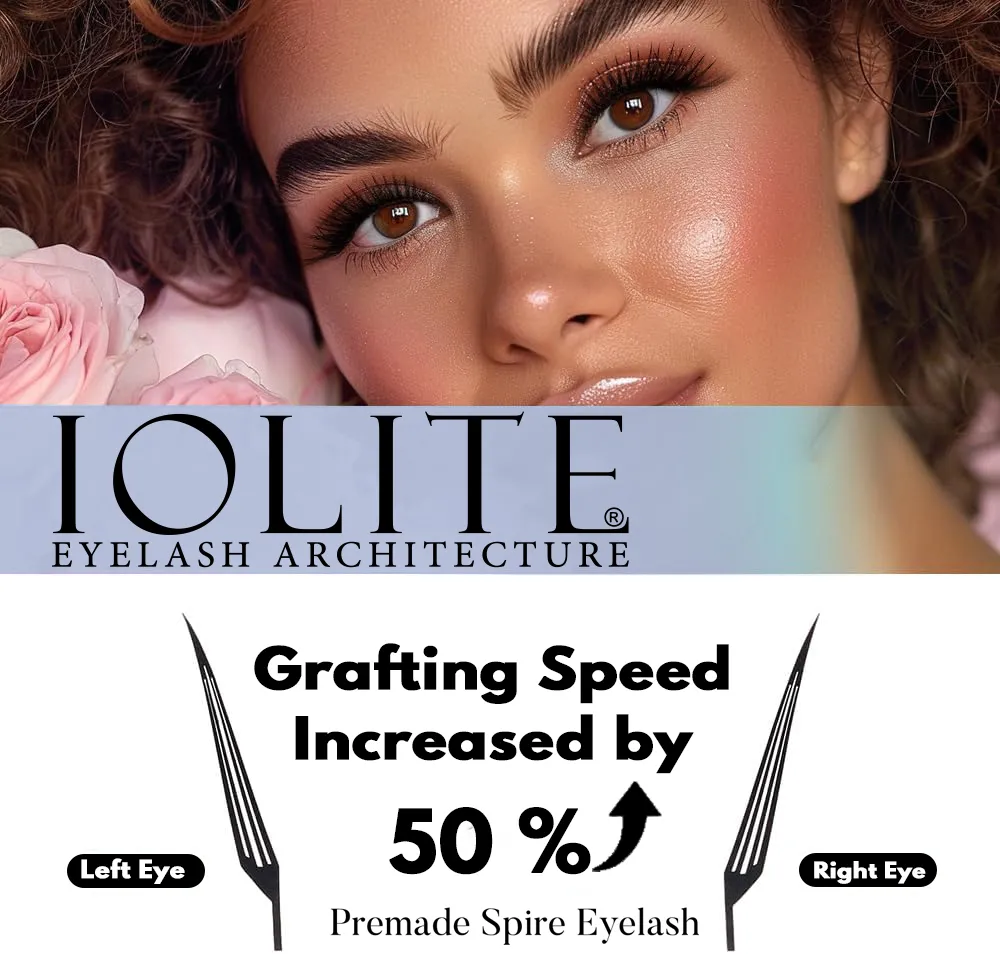 Iolite Eco Premade Spire Eyelash Extensions in CC Curl (7T) are revolutionizing lash application with pre-fanned, ready-to-apply spire/cone-shaped fans that cut grafting time by 50%. These innovative extensions arrive fully formed in a unique spire shape—eliminating the need for manual fan creation and delivering flawless, professional results instantly. Simply pick, dip, and apply!